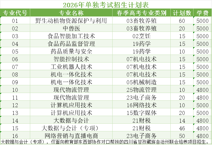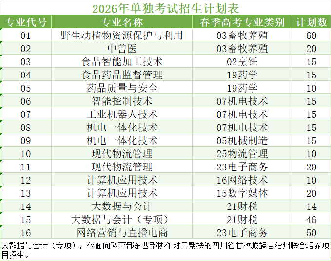 2026年单独考试招生计划